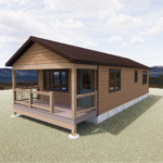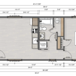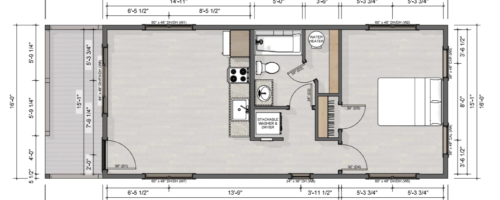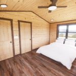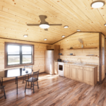 The cabin has 1 bedroom, 1 bathroom, and an open concept kitchen and great room with the option to add a second bedroom with a longer floor plan. With our 16′ units, you have the option of sheetrock or pine on the interior.