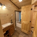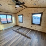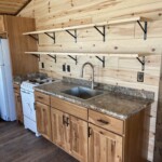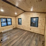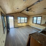The cabin has 1 bedroom, 1 bathroom, and an open concept kitchen and great room with the option to add a second bedroom with a longer floor plan. With our 16′ units, you have the option of sheetrock or pine on the interior.