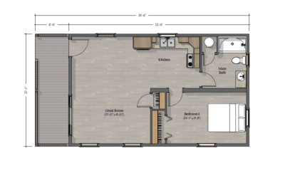 The bedrooms in this model are all on the same end of the cabin with the great room and deck on the other end.