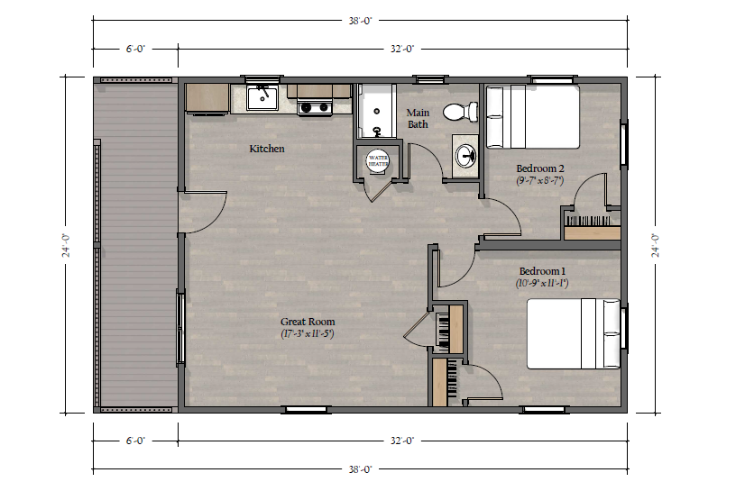 The bedrooms in this model are all on the same end of the cabin with the great room and deck on the other end.