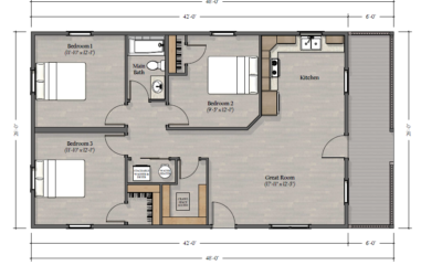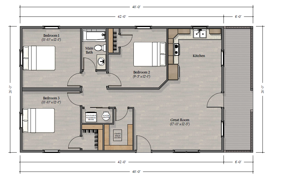 This layout allows for maximum use of floor space by avoiding hallways. Combining the great room and kitchen areas, along with the vaulted ceiling, makes for a comfortable central gathering space.