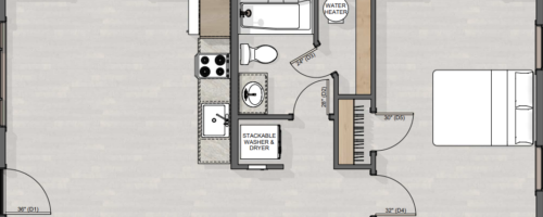The cabin has 1 bedroom, 1 bathroom, and an open concept kitchen and great room with the option to add a second bedroom with a longer floor plan.