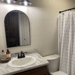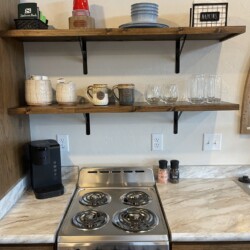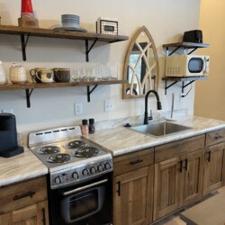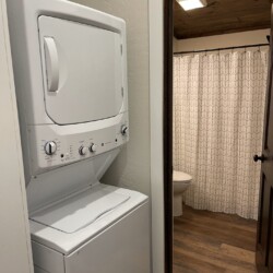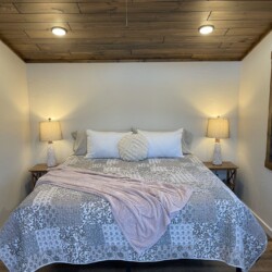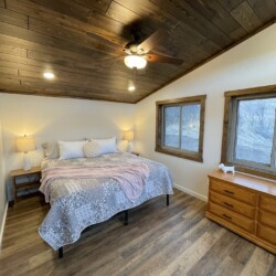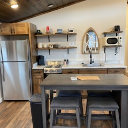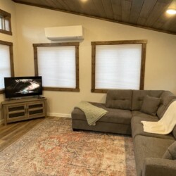 The cabin has 2 bedrooms, 1 bathroom, and an open concept kitchen and great room.