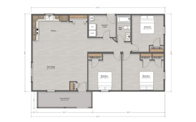 This layout has all the bedrooms on one side of the cabin and your kitchen and living room on the other. The master bedroom has his & hers closets.