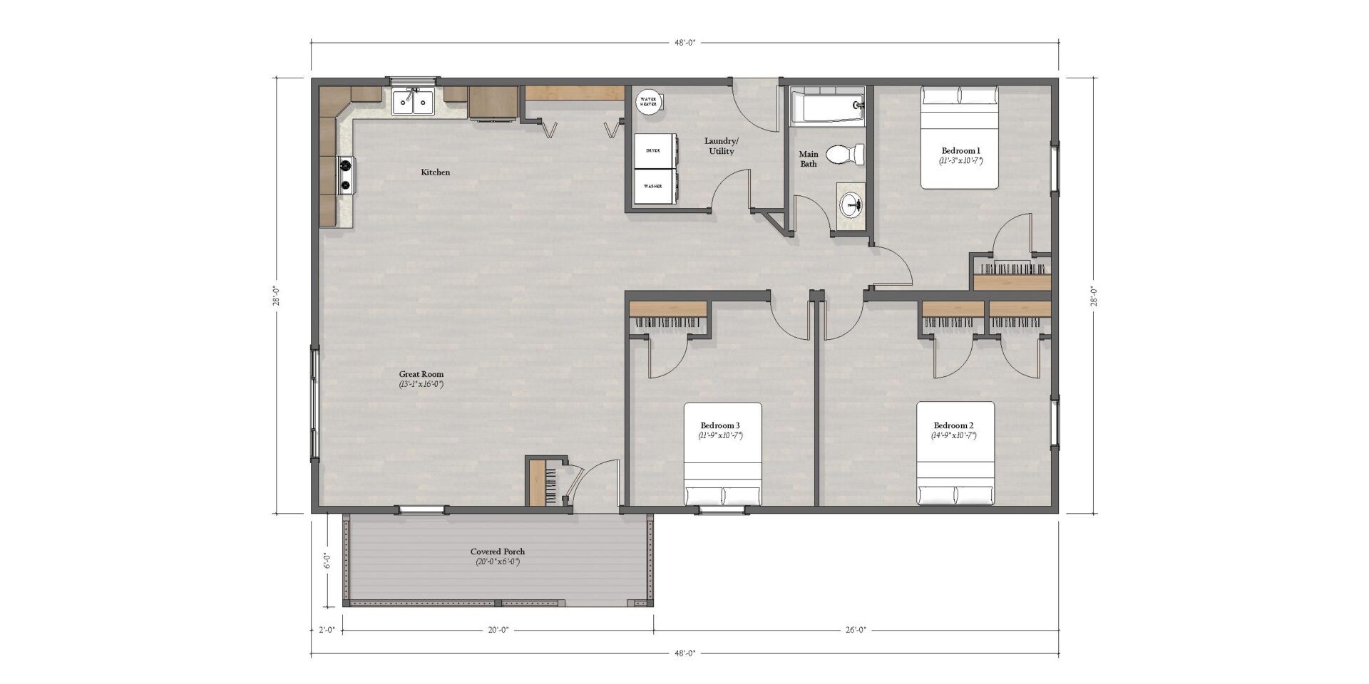 This layout has all the bedrooms on one side of the cabin and your kitchen and living room on the other. The master bedroom has his & hers closets.